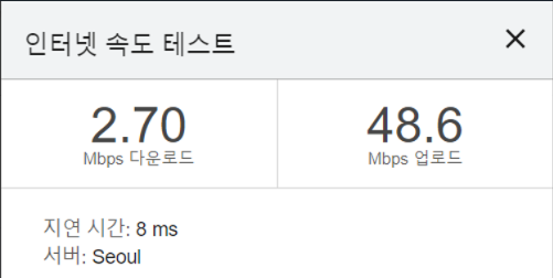 참고로 Mbps 다운로드 속도 2.7과 Mbps 업로드 속도 48.6은 높을수록 와이파이 속도가 빨라집니다.